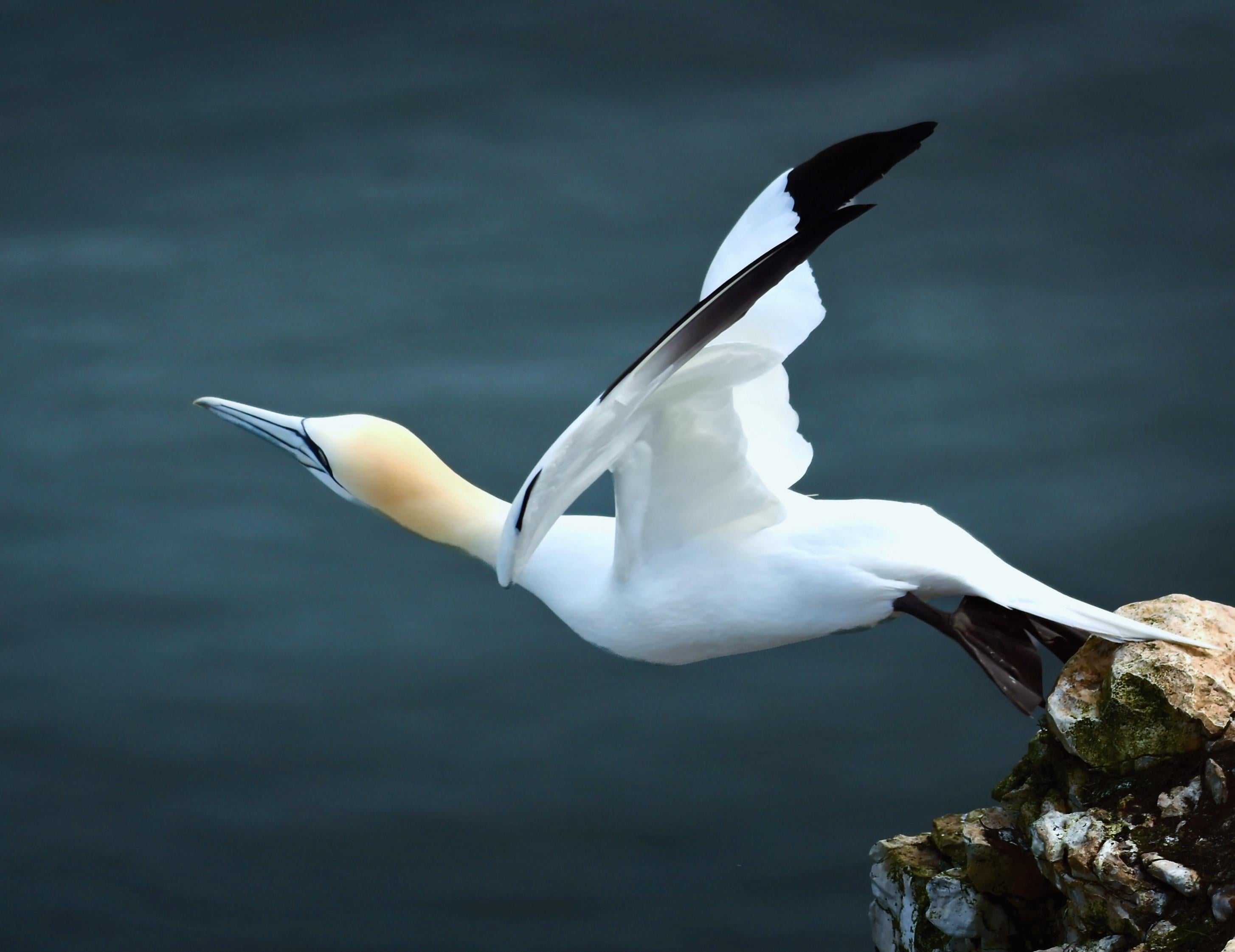 Gannet startet anmutig von einem Felsen bei RSPB Bempton Cliffs