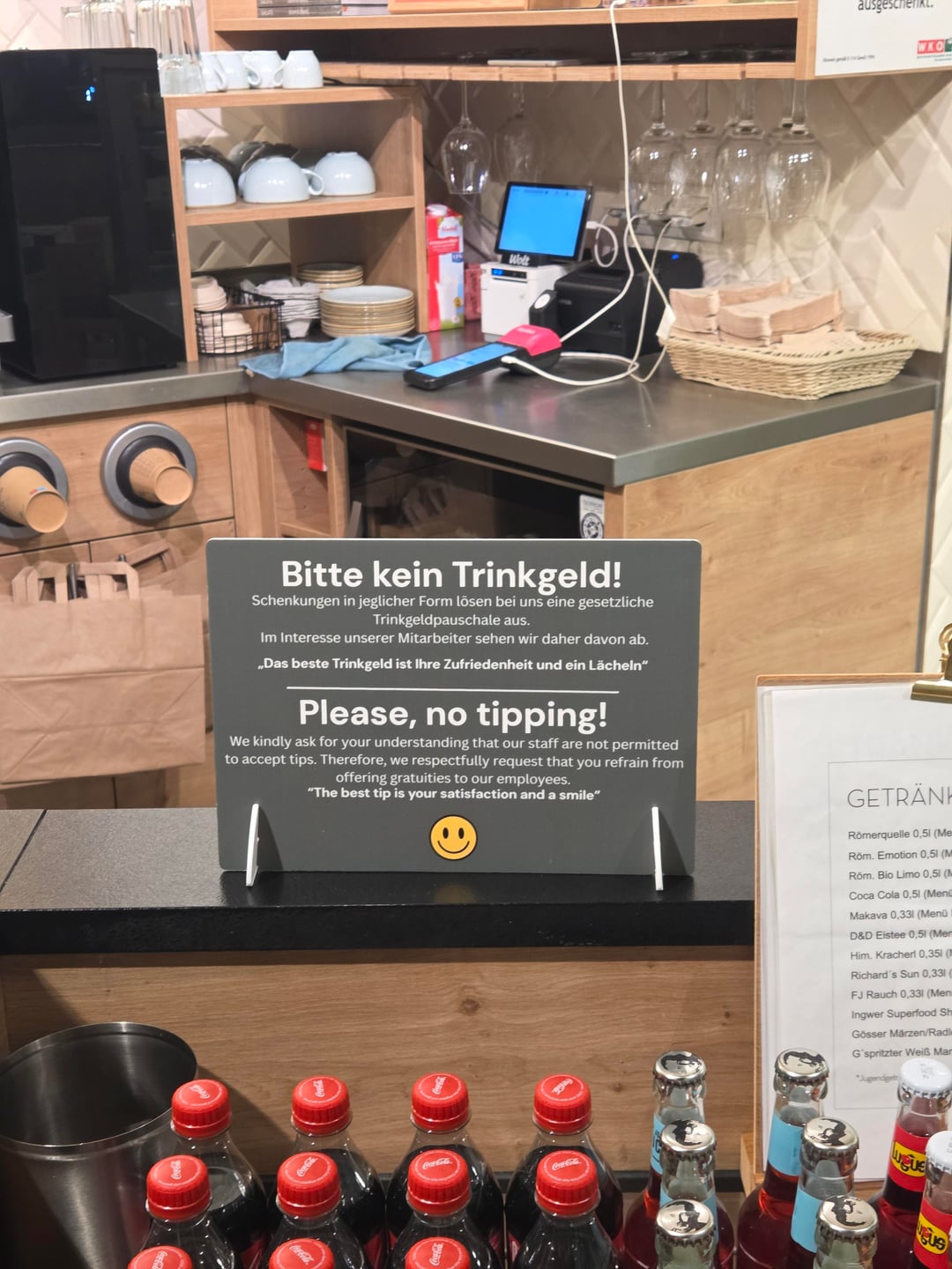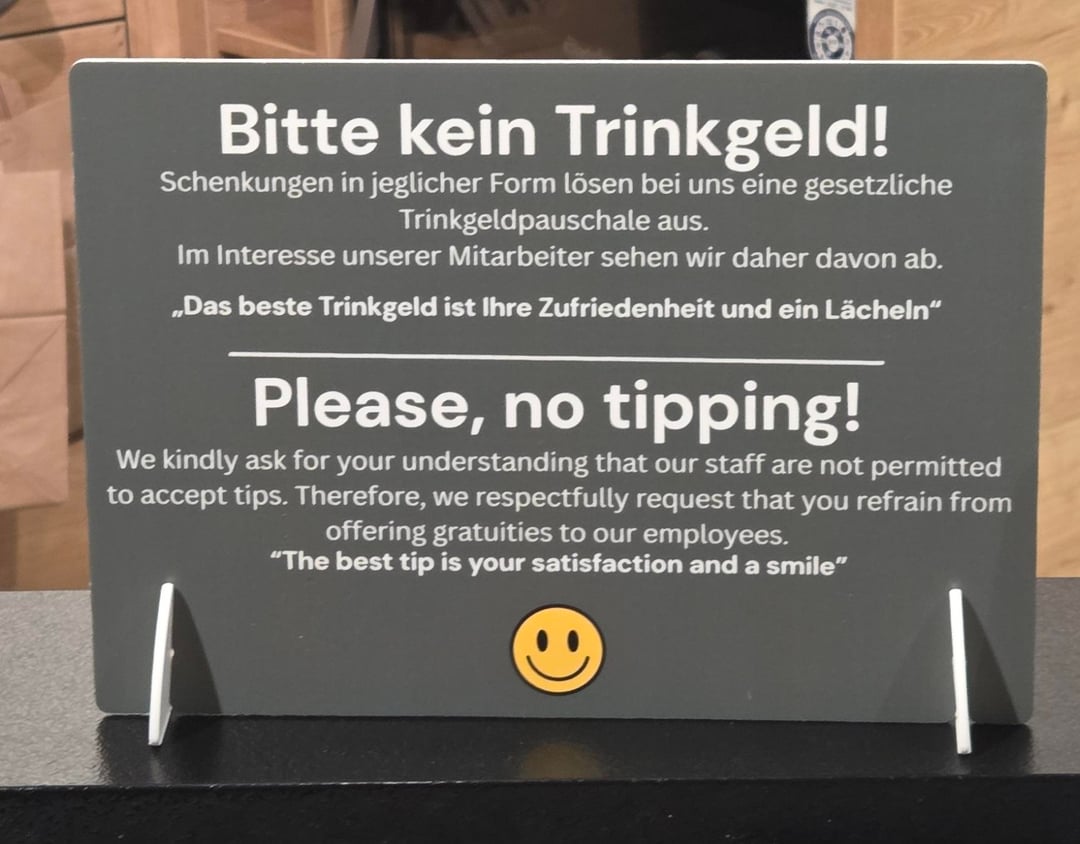 Bekommt man also über 12 Euro Trinkgeld im Monat, dann lohnt es sich für den Arbeitnehmer und erhöht auch die Ansprüche für Arbeitslosengeld und Pension minimal. Aber, und deshalb gibts das Schild: der Arbeitgeber muss auf die 65 Euro die Dienstgeberanteile zahlen, das sind etwa 15 Euro.