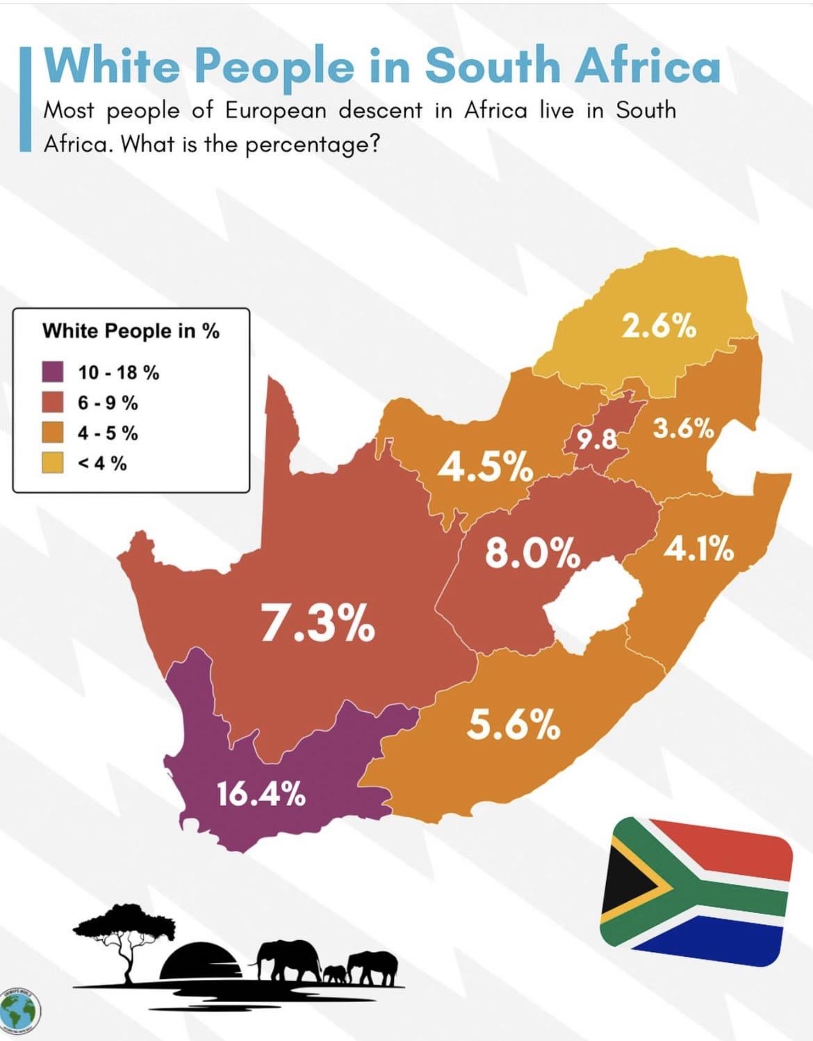 White people reached a peak percentage in South Africa in 1911 at 22.7%. These are the % of white people in South Africa in different years: