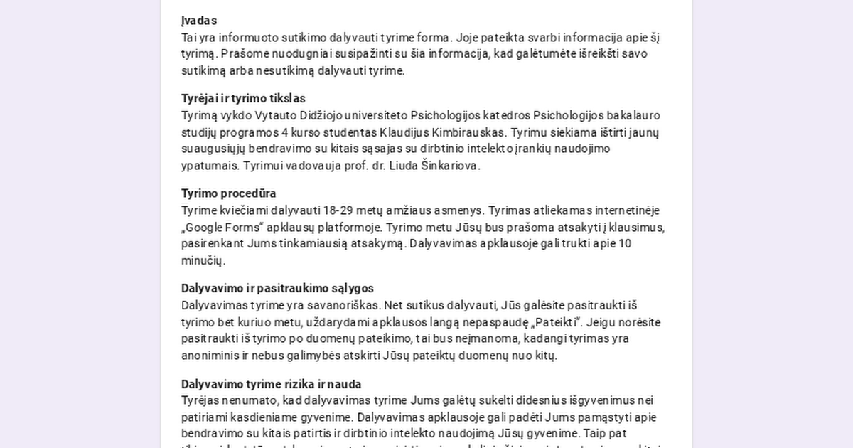 Ich bin Klaudijs Kimbirauskas, ein Bachelorstudent der Psychologie an der VMU, und ich lade alle Personen im Alter von 18 bis 29 Jahren herzlich ein, an meiner Abschlussarbeit für die Bachelorarbeit teilzunehmen. Die Teilnahme ist anonym und dauert ca. 10 Minuten 🙂.