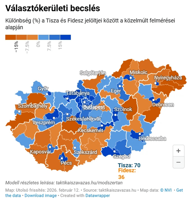 Schätzungen zum Wahlergebnis laut Umfragen. Orange: Viktor Orbans Partei (Fidesz) Blau: Peter Magyars Partei (Tisza). Je dunkler die Farbe, desto größer ist der Vorsprung in diesem Bezirk.