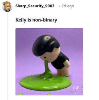 Im Subreddit der Serie gab es einen Beitrag zu den neuen Folgen. Ich habe mich angemeldet und dies für mein unbekanntes Geschlecht geschrieben "Kelly ist nicht-binär 🤮"drückte meine Enttäuschung aus und nach einem Tag wurde ich verboten, weil es ein Ausdruck von Hass war. 😂 Liege ich falsch oder haben die Idioten, die sie unterstützen, das Recht, zu tun und zu schreiben, was sie wollen, und die anderen, die sie nicht mögen, haben kein Recht, ein Wort zu sagen, selbst wenn sie elementare Kritik wollen?