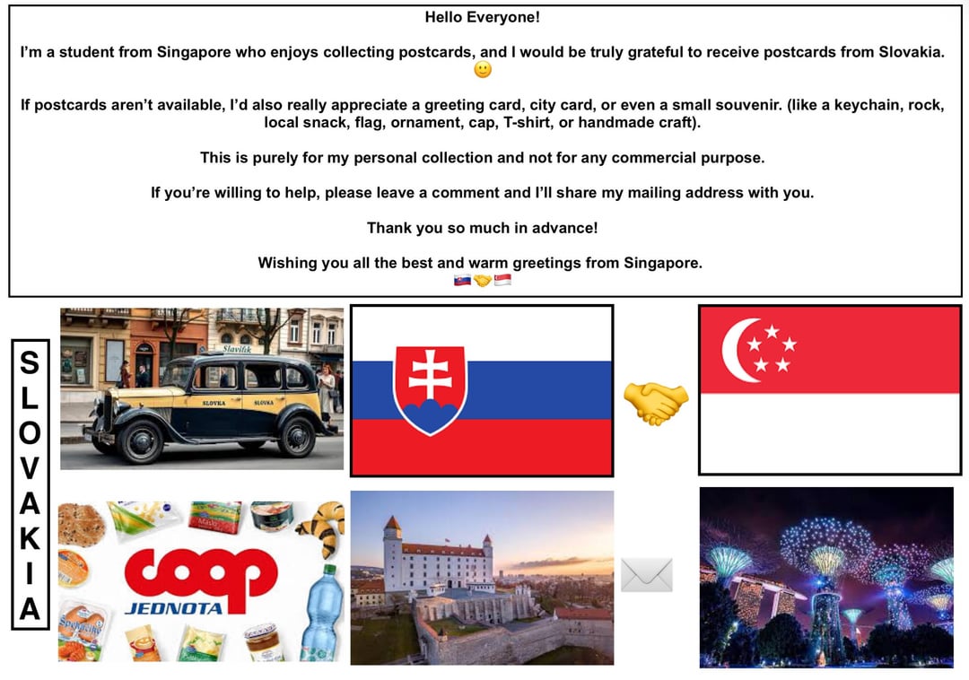 Ich bin ein Student aus Singapur, der gerne Postkarten sammelt, und ich wäre wirklich dankbar, wenn ich Postkarten aus der Slowakei bekommen würde. 🙂