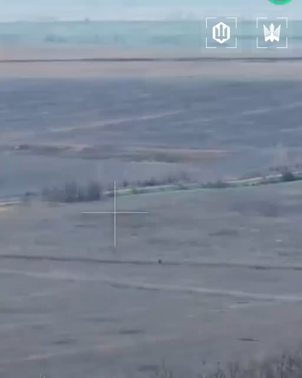 FPV-Kamikaze-Drohne trifft russischen Soldaten, der eine unbefestigte Straße entlang läuft. 414. Streik-UAV-Brigade der Ukraine, veröffentlicht am 14. April 2026.