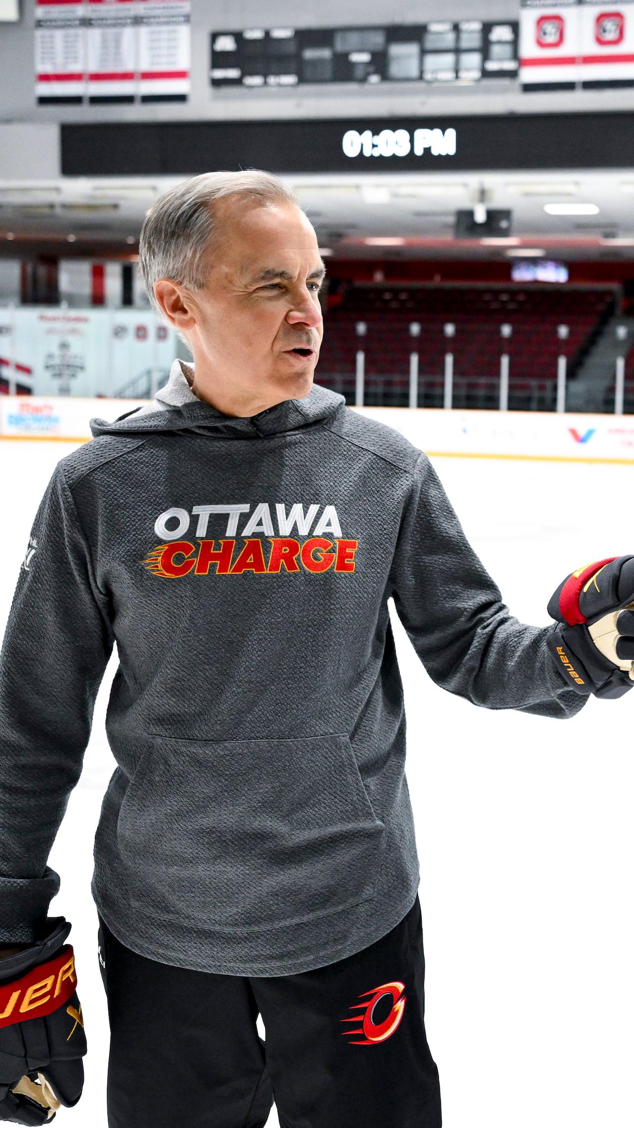 Premierminister Mark Carney und der finnische Präsident Alexander Stubb gingen am Dienstag im TD Place aufs Eis. Die beiden Anführer absolvierten einige Übungen mit dem Charge, bevor sie für ein Foto mit dem Team posierten.