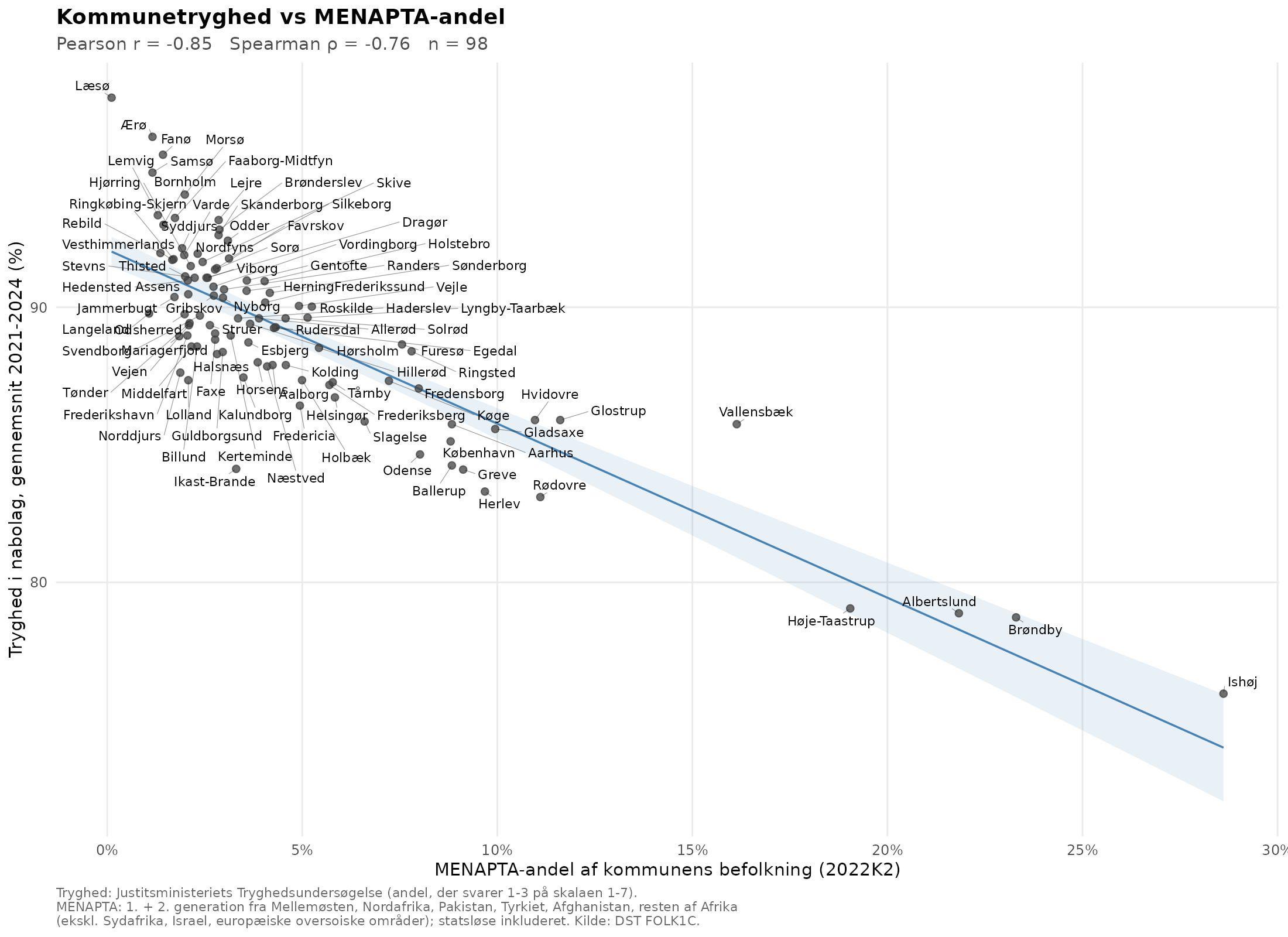Fun fact: hvis man kigger lidt nærmere på akserne, så passer det ret godt med at andelen af METAPTA er lig andelen der ikke føler sig trygge. Dvs. en mulig forklaringsmodel: METAPTA-personer i DK er alle utrygge!