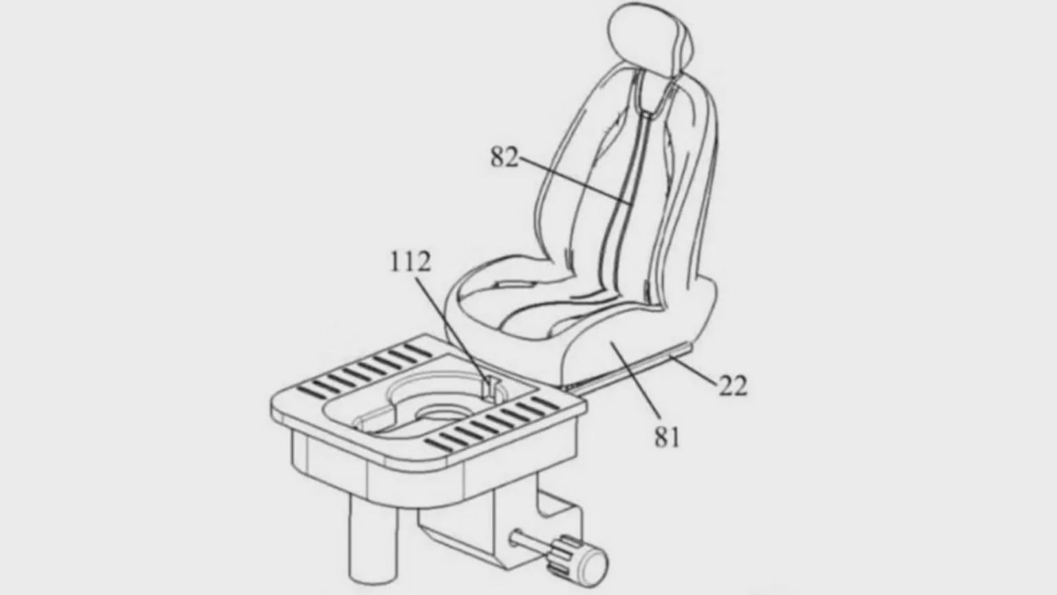 Die Patentanmeldung zeigt die Pläne der Firma Seres für eine Bordtoilette, die per Knopfdruck oder Sprachbefehl von der Unterseite des Beifahrersitzes ausfährt.