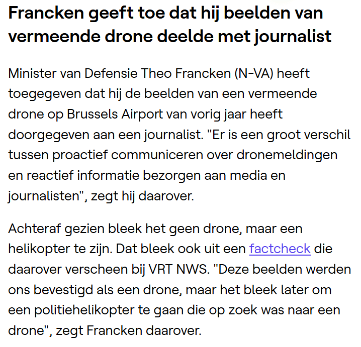 Dat hij die foto deelde is inderdaad onorthodox. Maar iedereen lijkt hier te vergeten dat meerdere andere bronnen wél een drone hebben gespot – professionals binnen luchtvaart en civiele diensten. Franken heeft die luchthaven niet tot tweemaal toe gesloten. Die hele Pano-reportage is niet koosjer.