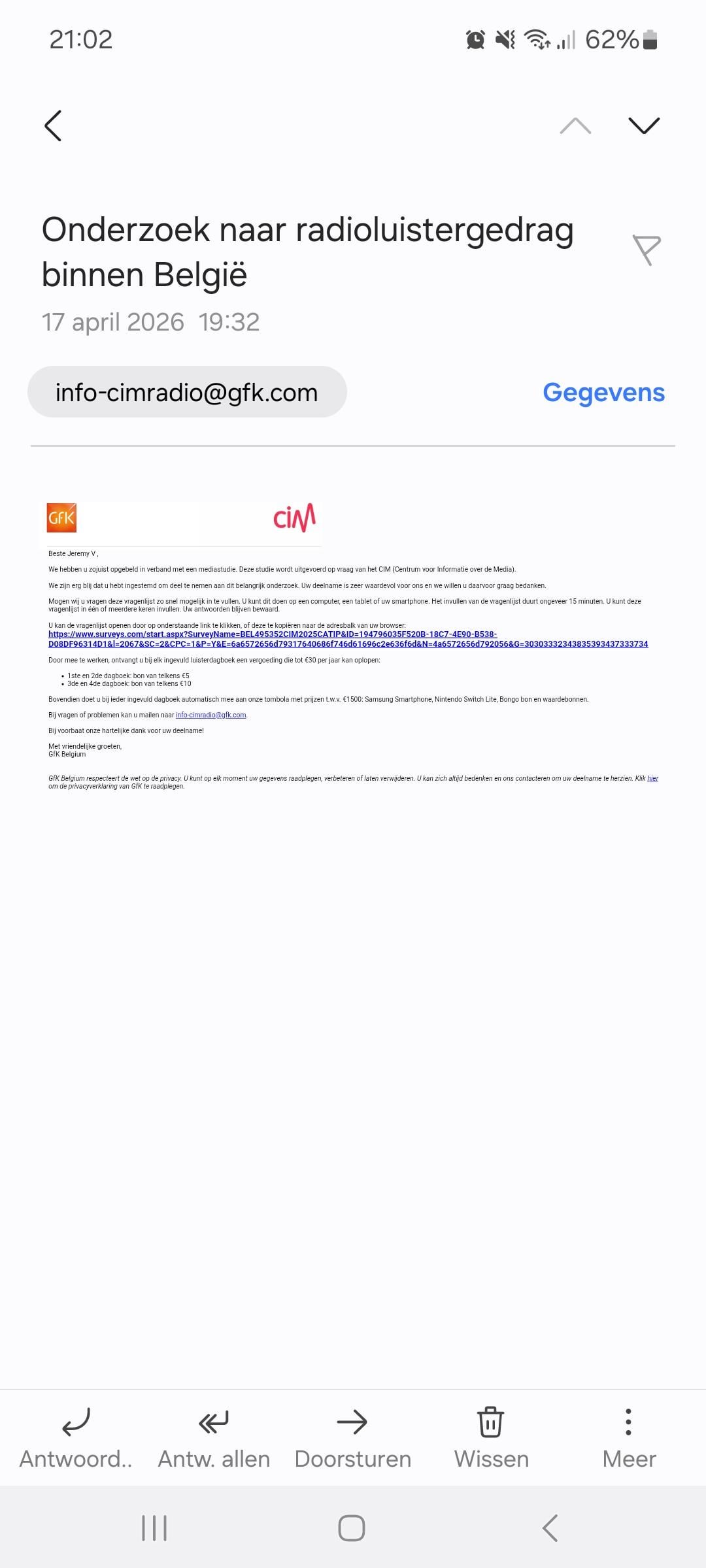 Ich habe heute (glaube ich) einen Anruf vom CIM wegen einer Studie erhalten, die sie über die Funknutzung in Belgien durchführen. Ich dachte, warum nicht, aber nach dem Anruf (wie kamen sie überhaupt an meine Nummer?) schickten sie mir eine Umfrage per E-Mail.