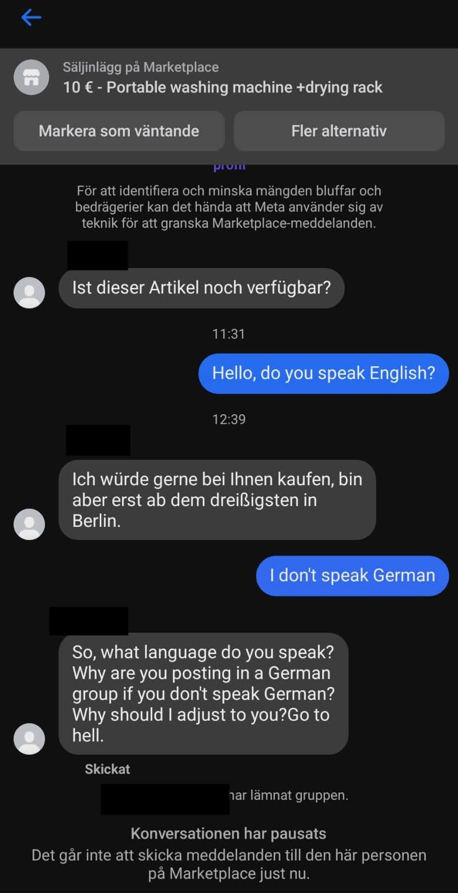 7. Anmäl det i appen och gå vidare. Jag bor också i Tyskland och man blir rätt less på dem. Världens tråkigaste människor.