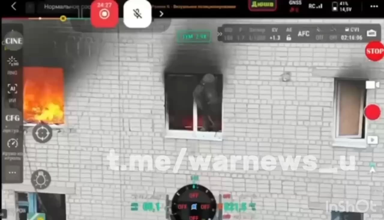 Russischer Soldat springt aus brennendem Gebäude und wird von ukrainischem Kleinwaffenfeuer getroffen. Oblast Charkiw, Datum unbekannt