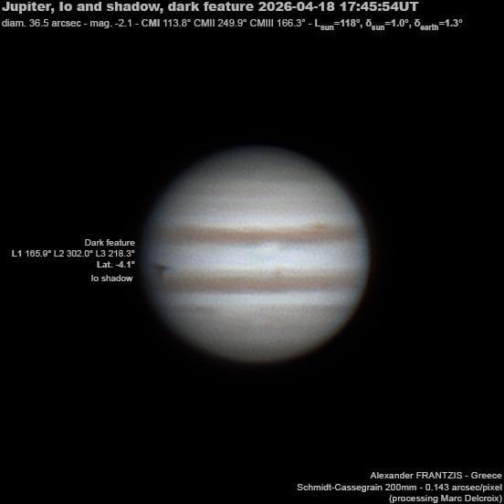 Am 18. April 2026 (~17:38 UTC) entdeckten Astronomen einen länglichen dunklen Fleck in Jupiters Atmosphäre. Erste Spekulationen deuten auf eine mögliche Kollision mit einem über 100 Meter großen Objekt hin. Für Folgebeobachtungen sollte die betroffene Region nach 13:30 UTC der Erde zugewandt sein.