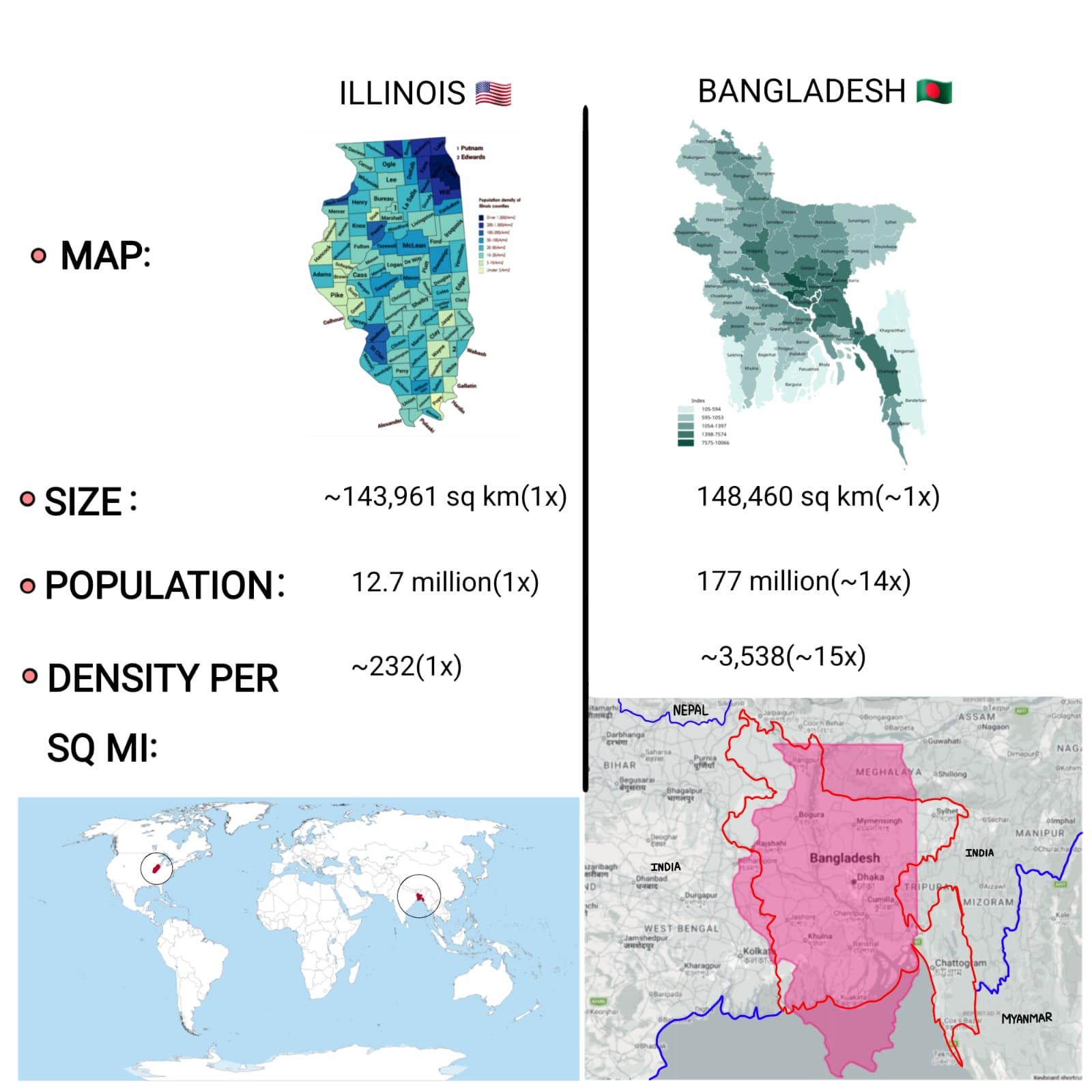 *FACT: Illinois has about* ***12.6 million*** *people, while Bangladesh has over* ***171 million*** *people living in roughly the same amount of space.*