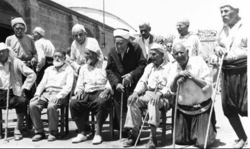 Der berühmte Geschichtenerzähler Aynalı (sein richtiger Name ist Mustafa Hussein) mit den Ältesten des Dorfes Sinta im Hafen von Famagusta. Er war unter türkischen Zyprioten bekannt, weil er am Kyrenia-Tor auf einen Hocker kletterte und die Menge mit seinen Geschichtenerzählungen, epischen Vorträgen und Ghazals unterhielt. Er war außerdem Koranexperte und Imam und arbeitete eine Zeit lang als Polizist in Paphos für die britische Kolonie.