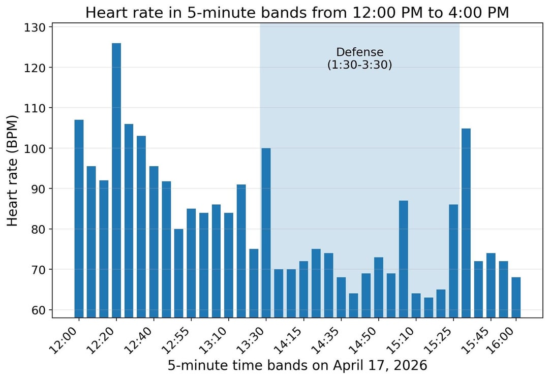 Meine Verteidigung fand von 13:30 bis 15:30 Uhr statt. Beachten Sie, wie gestresst ich im Vorfeld bin, und dann komme ich während der Verteidigungspräsentation irgendwie in Schwung. Und dann steigt der Stresspegel während der privaten Befragung und kurz vor der Bekanntgabe der endgültigen Entscheidung erneut an.