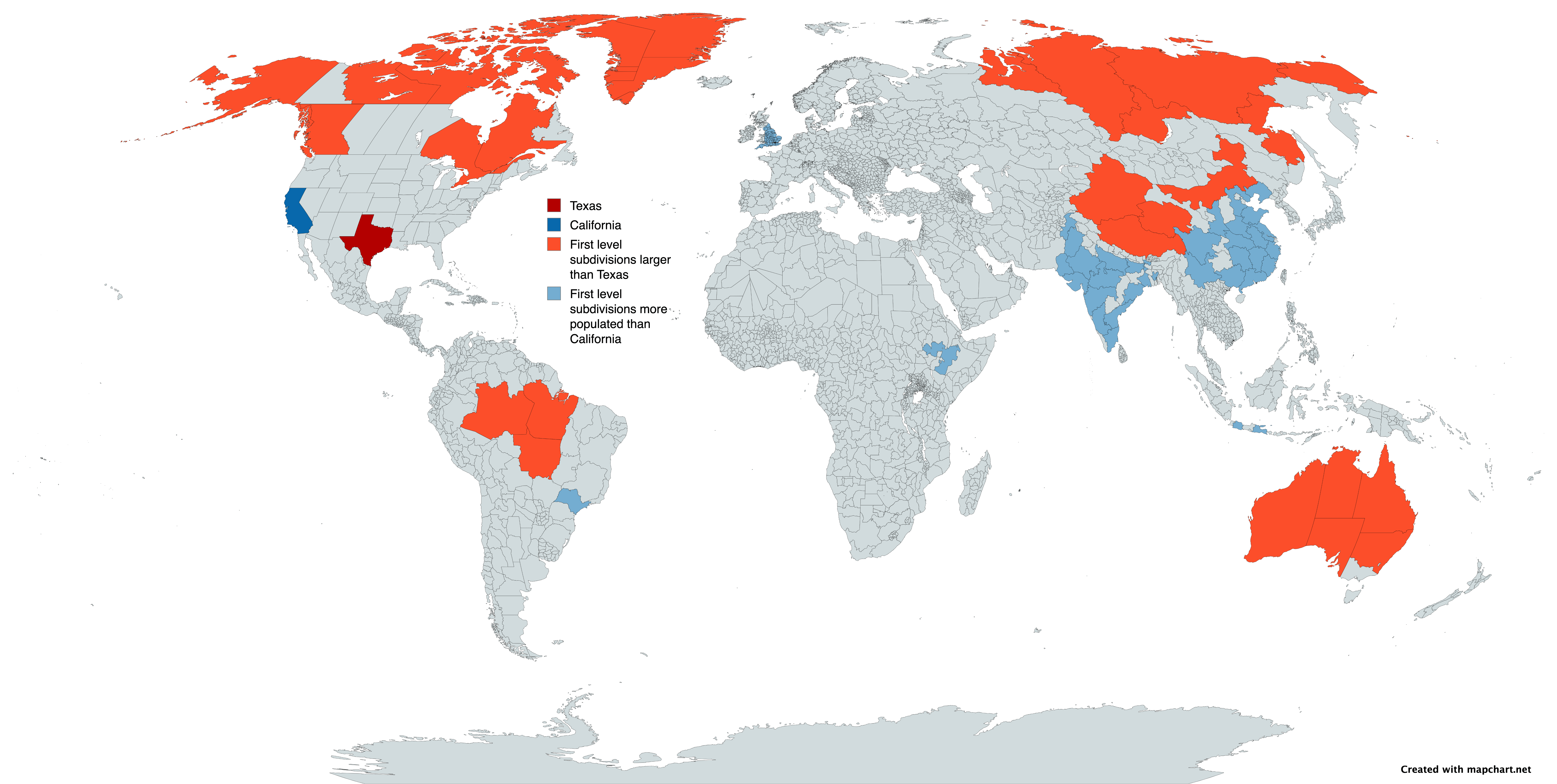 Are there any subdivisions that are both bigger than Texas and more populous than California?