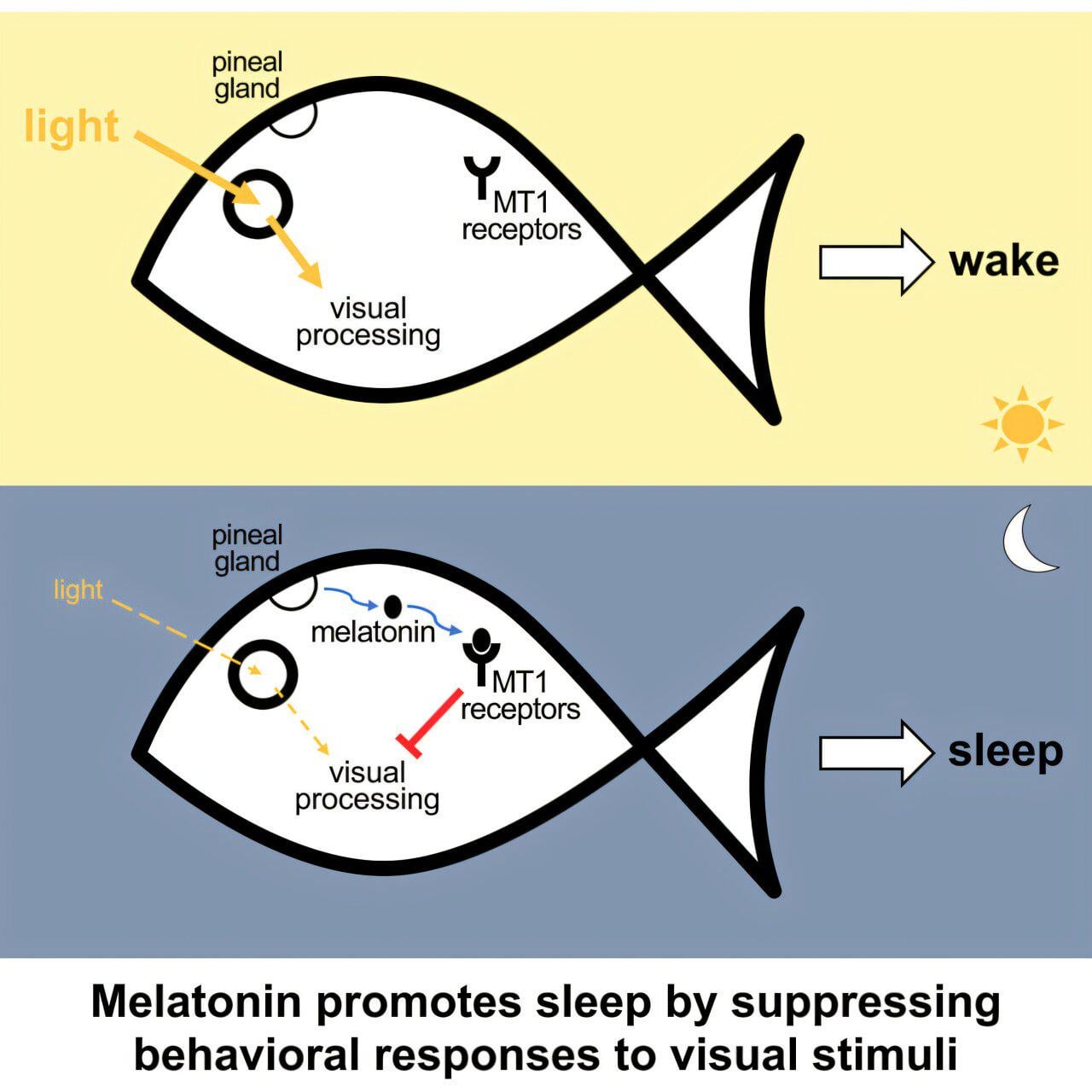 Hill fand heraus, dass MT1-Rezeptoren vor allem in einer Gehirnregion, dem Optic tectum, zu finden sind, die eine wichtige Rolle bei der Verarbeitung sensorischer Informationen, insbesondere visueller Reize, spielt. Das Team stellte dann die Hypothese auf, dass Melatonin den Schlaf fördert, indem es die Aktivität dieser Neuronen reduziert, was zu einer verringerten Verhaltensreaktion auf visuelle Reize führt.