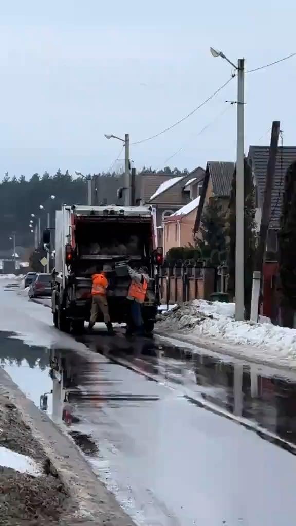 Aufnahmen von zwei ukrainischen Umweltdiensttechnikern, die Recyclingbehälter leeren, während ein vorbeifahrendes iranisch-russisches „Shahed“-UAV von mobilen Luftverteidigungsteams angegriffen wird.