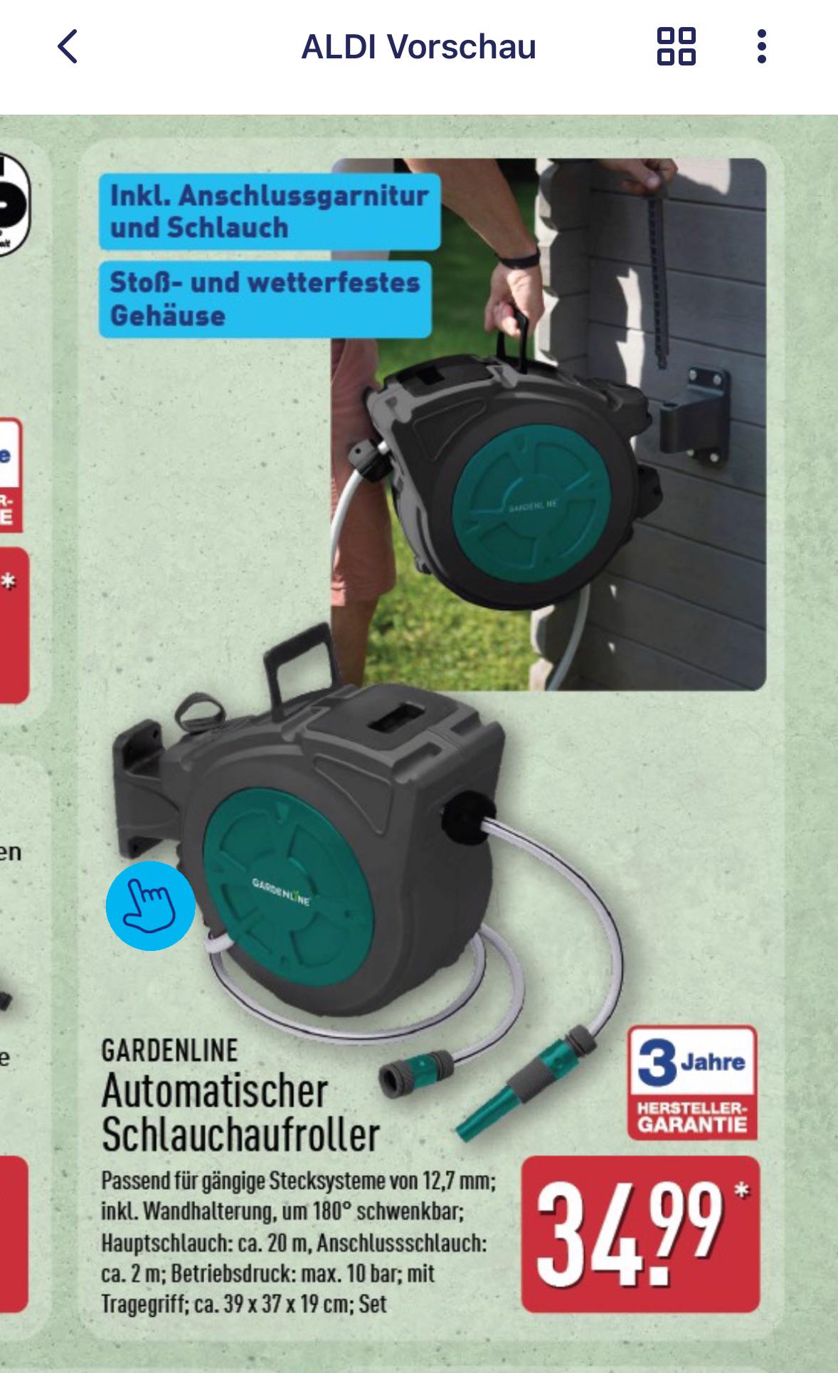 Ich hatte noch nie sowas. Im Shop https://www.aldi-nord.de/produkt/automatischer-schlauchaufroller-3144.html steht „Hauptschlauch: ca. 20 m lang, Anschlussschlauch: ca. 2 m lang“