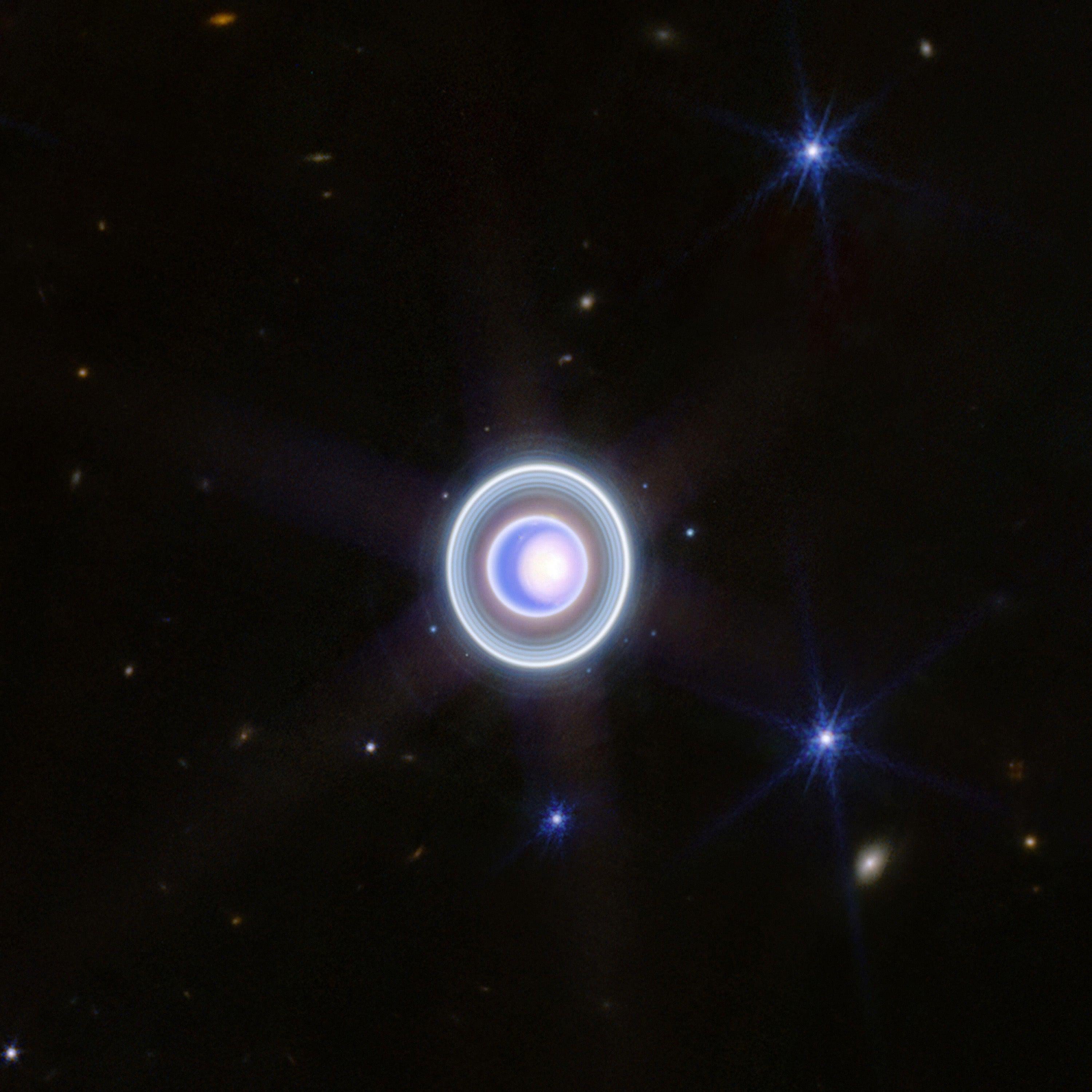 Das James Webb-Weltraumteleskop der NASA hat Uranus mit seiner Nahinfrarotkamera (NIRCam) in atemberaubenden Details eingefangen. Das Bild zeigt deutlich die helle Nordpolkappe des Planeten, die dunkle Spur, schwache Ringe und den schwer fassbaren Zeta-Ring, der dem Planeten am nächsten liegt. Es zeigt auch 9 der 27 Uranusmonde als kleine blaue Punkte um die Ringe.