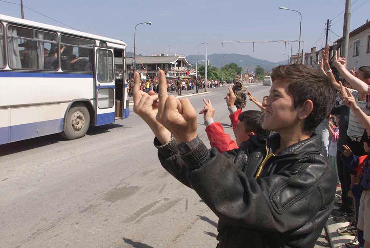 Junge Kosovo-Albaner machen obszöne Gesten gegenüber einem Bus voller serbischer Polizisten, der mit Bussen aus der Kosovo-Region abtransportiert wird (1999)