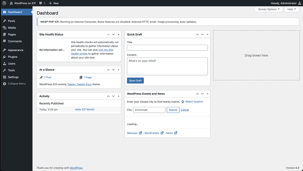 Share Facebook Twitter LinkedIn Pinterest Bluesky Threads WordPress läuft zu 100 % in der Kette auf dem Internetcomputer mit PHP 8.5 und WASQL – Entwickler https://forum.dfinity.org/t/wordpress-running-100-on-chain-on-the-internet-computer-with-php-8-5-and-wasql/67986
