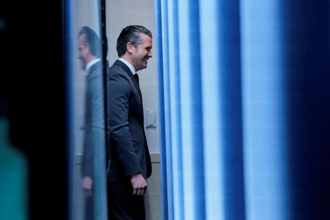 Ehrliches Foto von Verteidigungsminister Pete Hegseth, nachdem er eine Pressekonferenz von Präsident Donald Trump im Weißen Haus verlassen hatte, nach einer Schießerei während des jährlichen Abendessens der Korrespondentenvereinigung des Weißen Hauses in Washington, D.C