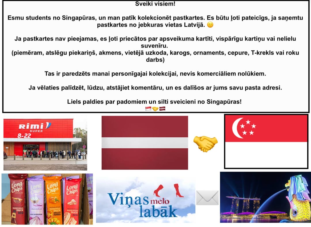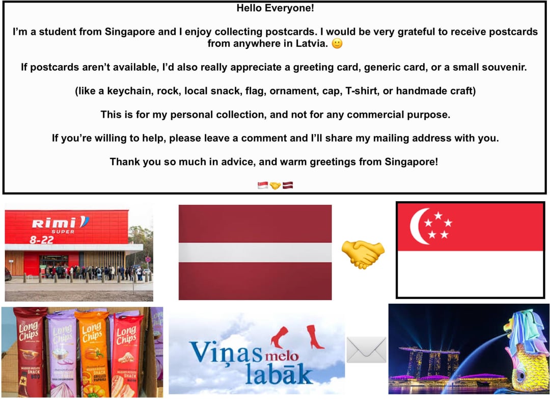Ich bin ein Student aus Singapur und sammle gerne Postkarten. Ich wäre sehr dankbar, Postkarten aus ganz Lettland zu erhalten. 🙂