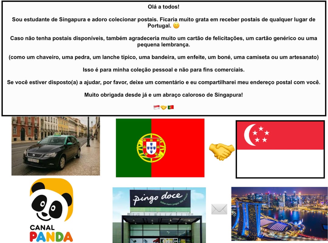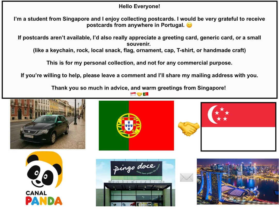 Ich bin Studentin aus Singapur und sammle gerne Postkarten. Ich wäre sehr dankbar, Postkarten von überall in Portugal zu erhalten. 🙂