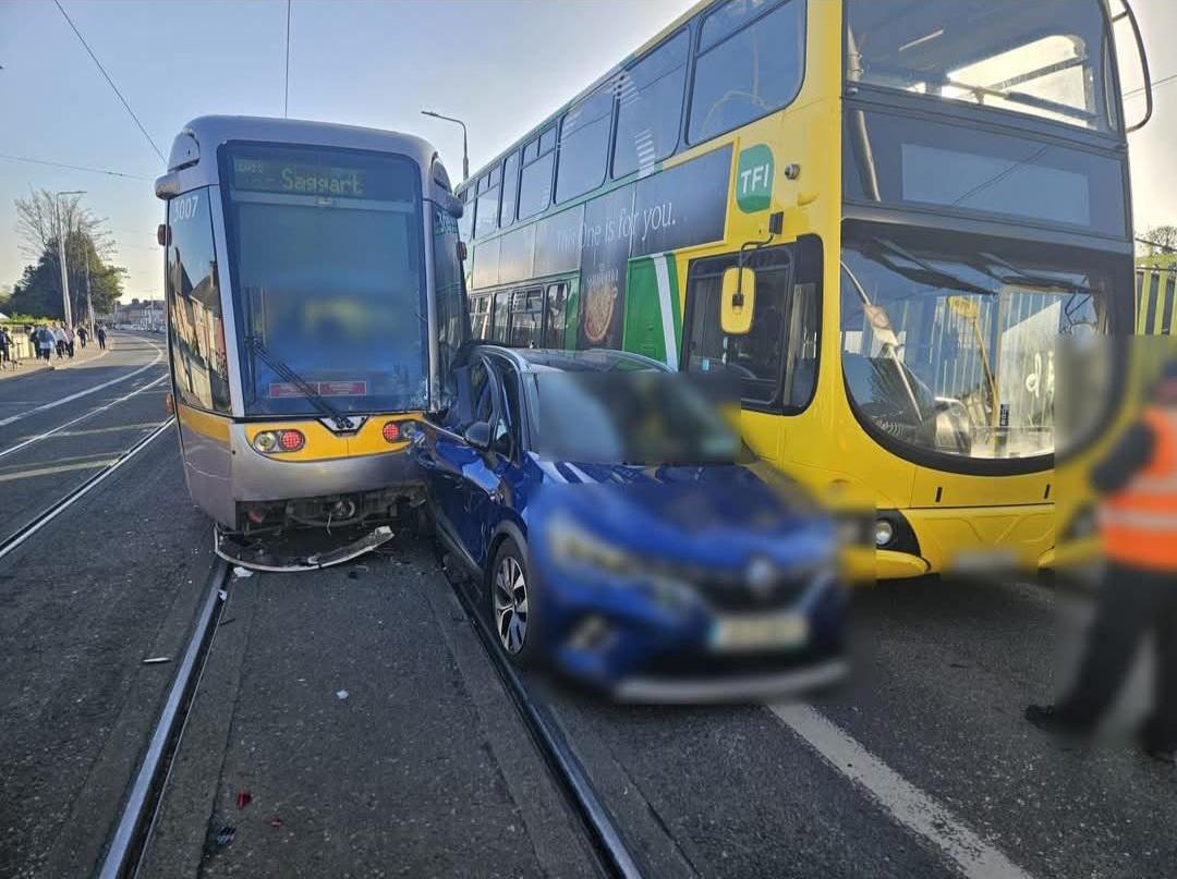 Looks like the car tried to overtake the bus and didn’t check mirrors for the luas 🫠