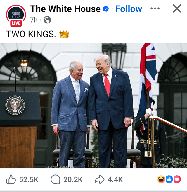 Przy całej mojej pogardzie dla Trumpa to oczywiste trollowanie protestów, które się niedawno odbywały w USA, pod hasłem „NO KINGS“.