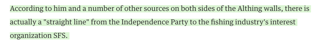 Laut den dänischen Nachrichten, die vor einigen Wochen erschienen sind, sagen zahlreiche Quellen sowohl innerhalb als auch außerhalb der Mauern von Alþingi, dass es tatsächlich eine „direkte Linie“ von der Unabhängigkeitspartei zum Verband der Fischereiunternehmen (SFS) gibt. Ich glaube, dass das Gleiche auch für die Zentralpartei und die Fortschrittspartei gilt.
