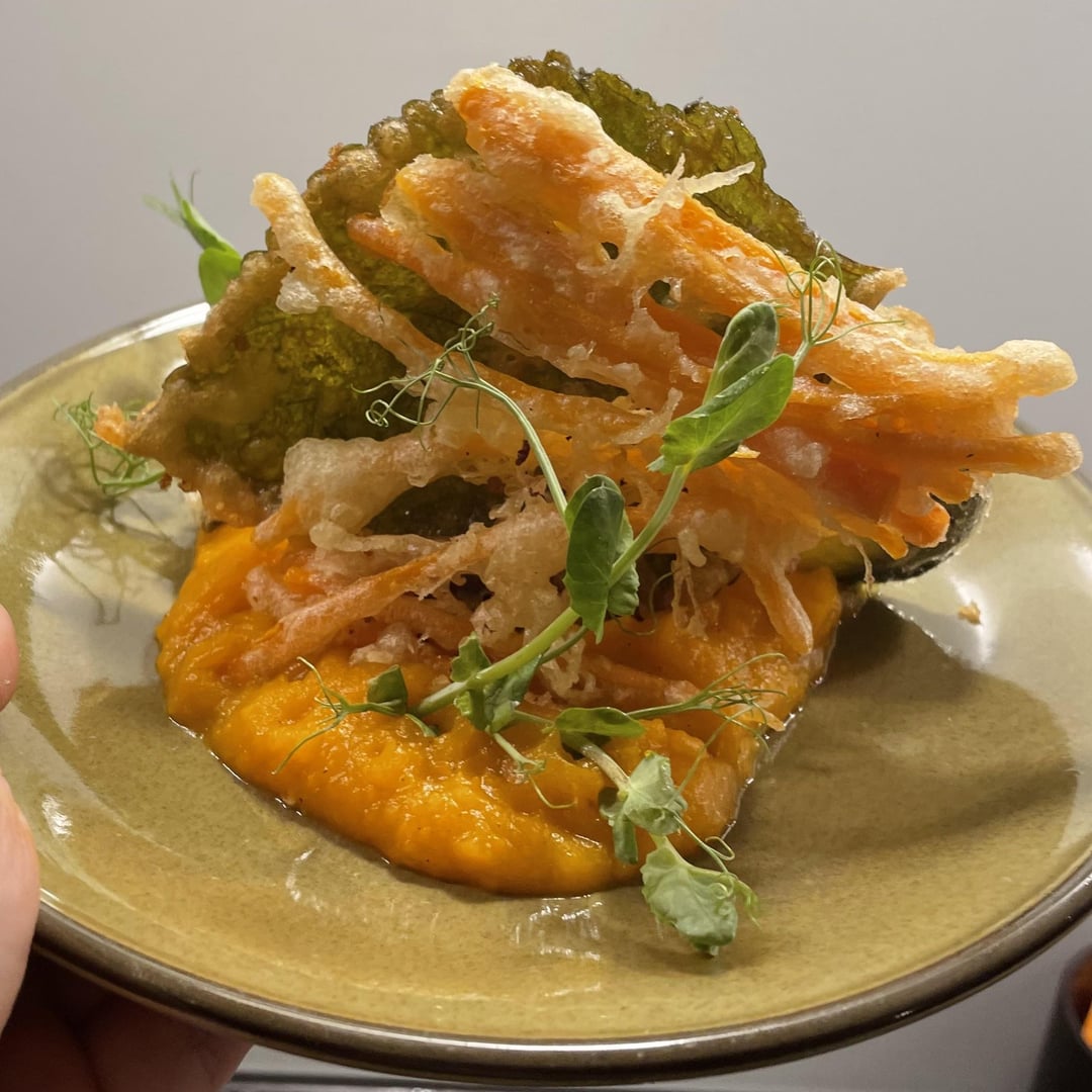 Erster Gang: Twigim (wie Tempura) auf Kürbismus. Frittiert habe ich: Perillablätter, Karotten, Austernpilze, Champignons, Aubergine, Zucchini, Kürbis.