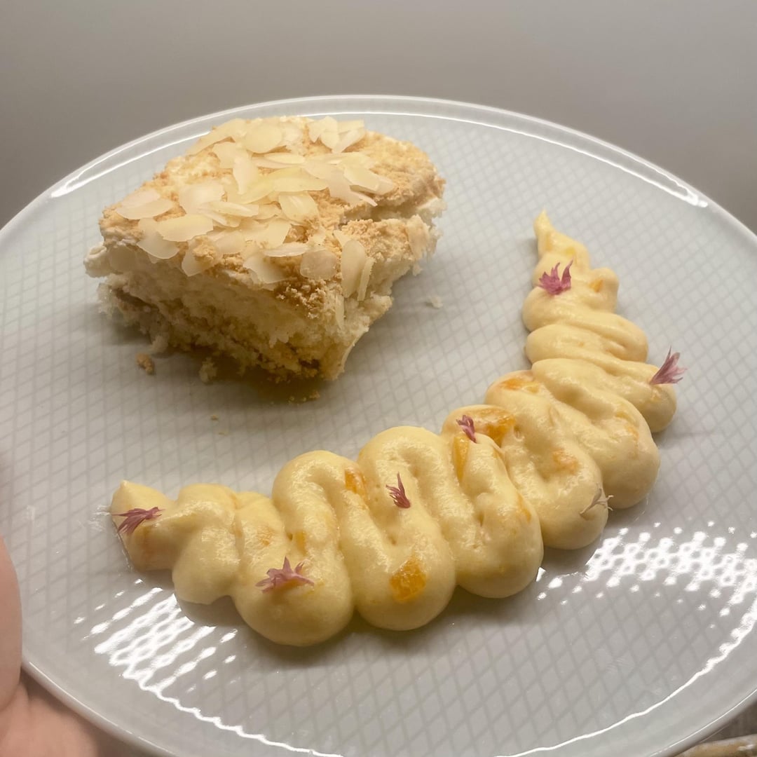 Dessert: Injeolmi-Tiramisu mit Aprikosencreme. Ich bin mit der Konsistenz des Tiramisu und der Creme nicht ganz happy. Leider war der Teig sehr bröselig und die Creme zu flüssig. Gut geschmeckt hat es trotzdem.