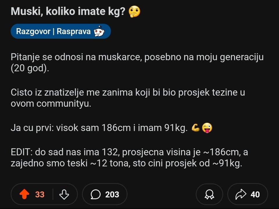 Von dieser Mini-Recherche an r/bihwo 132 Männer geantwortet haben, ist der durchschnittliche Redditor 186 cm groß und wiegt 91 kg. Daher beträgt der durchschnittliche BMI (Body-Mass-Index) in dieser Gemeinde 26,3 kg/m². 🤓