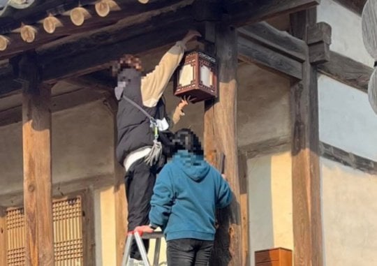 KBS-Dramateam nagelt an Säulen im Weltkulturerbe