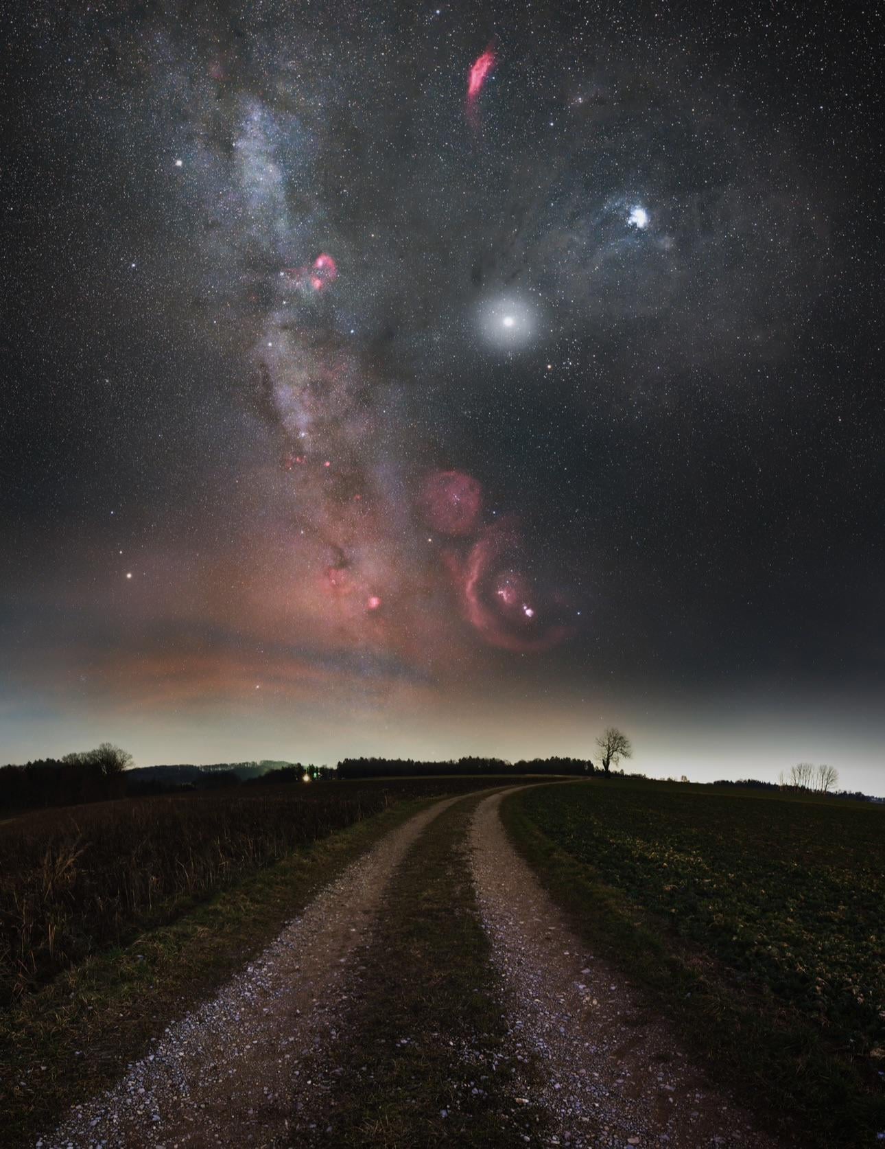 Das ist mit Abstand mein bestes Bild seit Beginn meines Astrofotografie-Hobbys. Es war ein großer Aufwand, aber ich denke, es hat sich gelohnt. Der Himmel zeigt mehrere Naturphänomene. In der Nähe des Horizonts ist rotes Luftglühen zu sehen, das sich bis zur mit Wasserstoff Alpha gefüllten Orion-Region erstreckt. Die markante Milchstraße verläuft vertikal durch das Bild, flankiert von Jupiter und Mars. Rechts davon sind der Kaliforniennebel und die Plejaden zu sehen, umgeben von einer riesigen Menge kosmischem Staub.