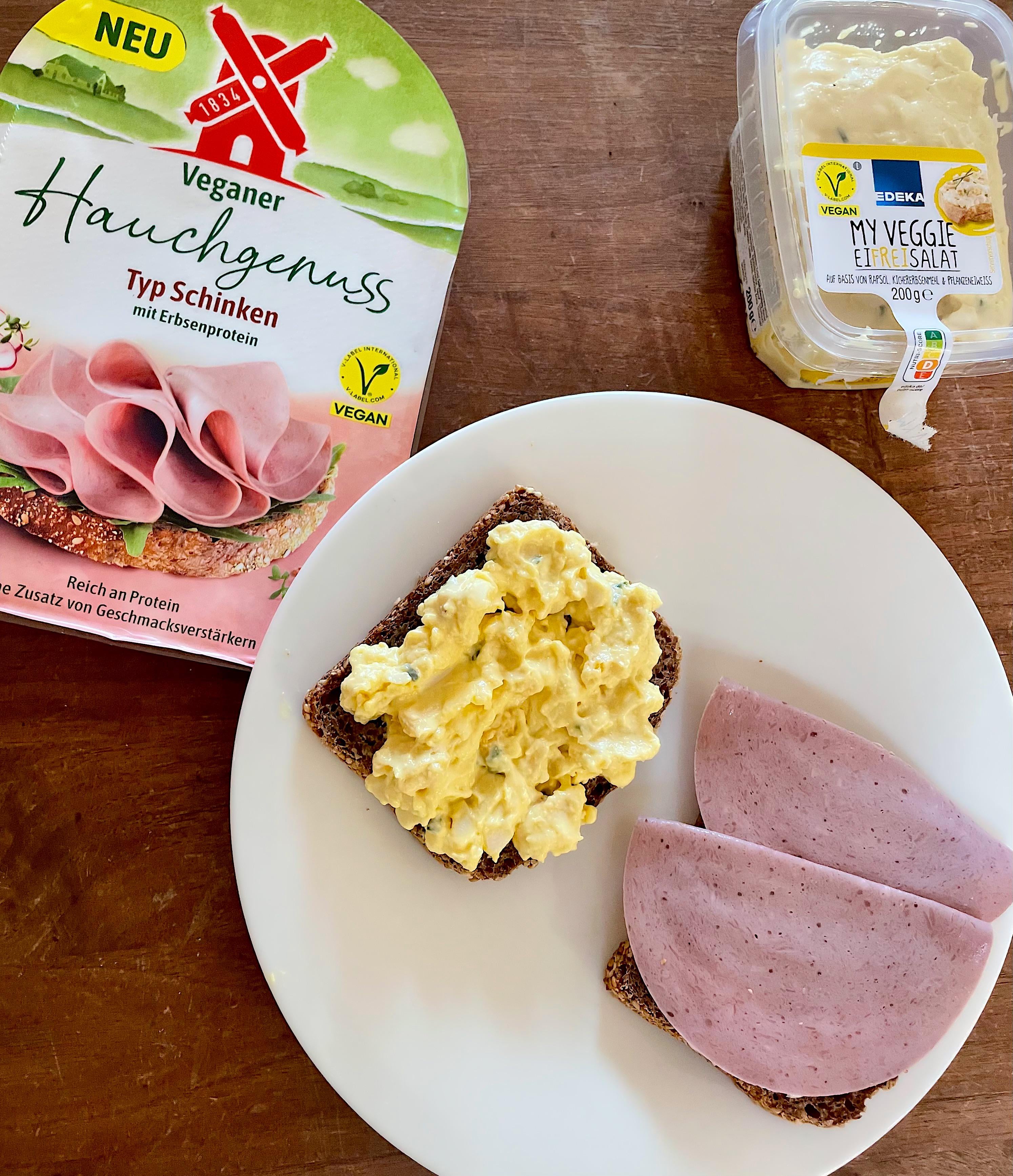 „Eins mit Hauchgenuss Typ Schinken mit Erbsenprotein und eins mit Eifreisalat auf Basis von Rapsöl Kichererbsenmehl und Pflanzeneiweiß“