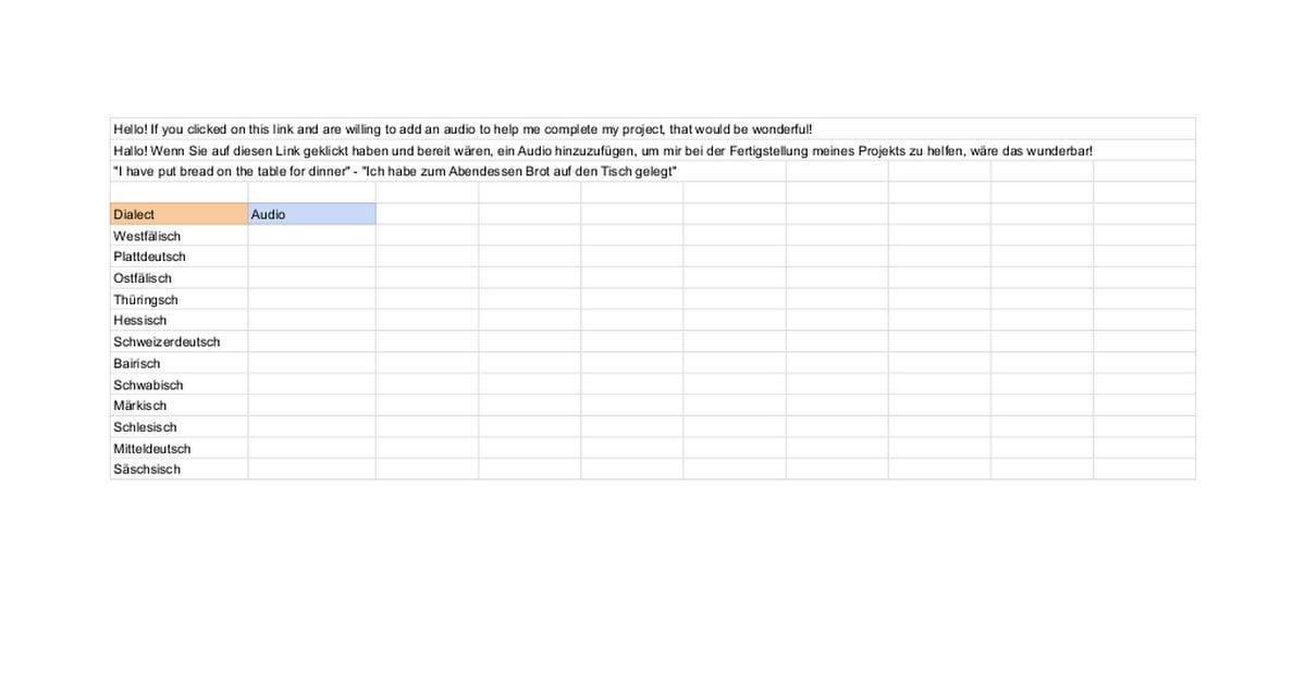 Ich habe eine Tabelle der Dialekte mit Spots für Audio -Links erstellt. Wenn es einen Dialekt gibt, den Sie hinzufügen möchten, fühlen Sie sich bitte frei! Auch hier wären alle Beiträge sehr geschätzt!