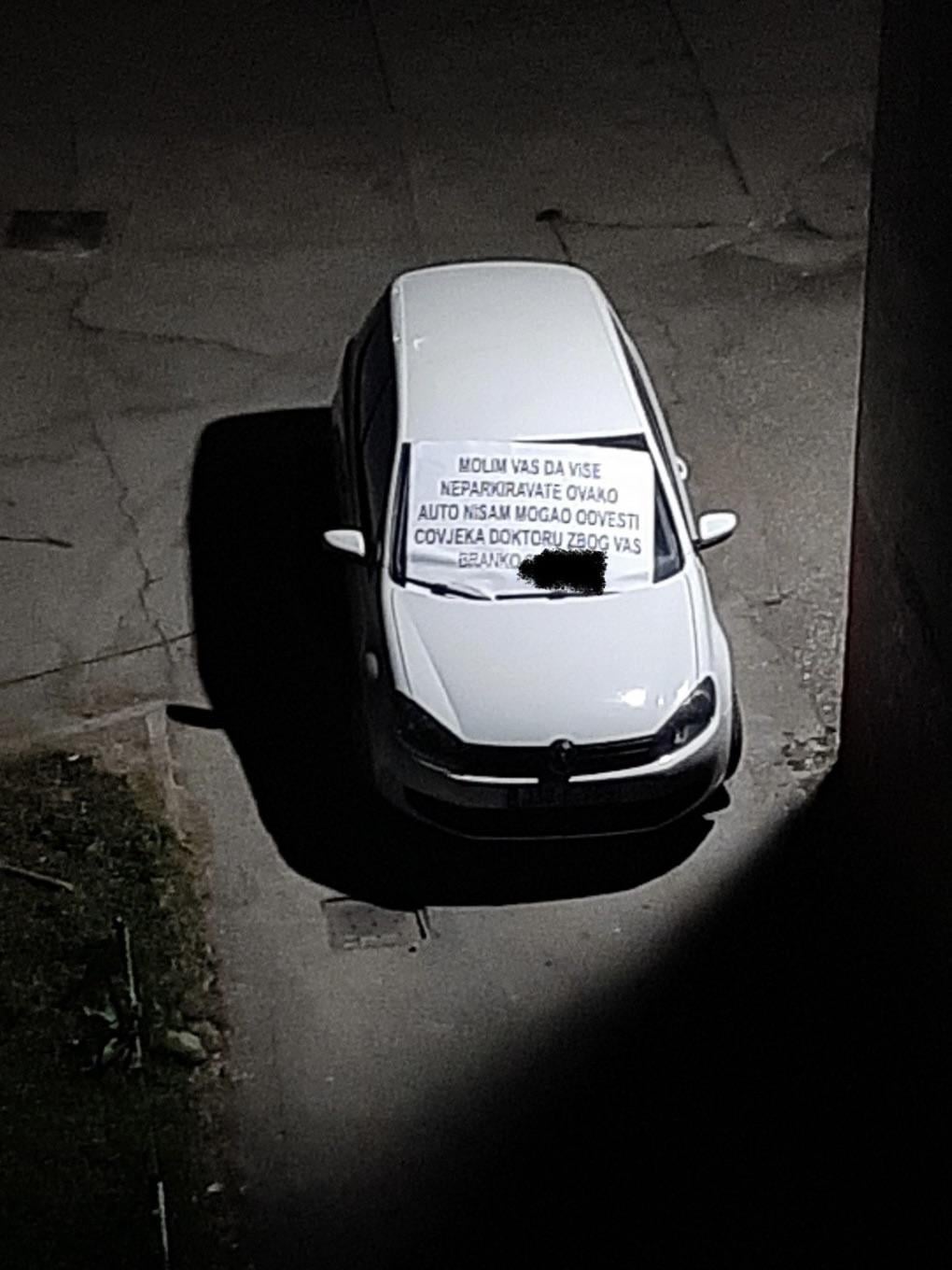 Elem, die seit Monaten in Frage stellt, parken seit Monaten auf der Passage und blockierte andere Fahrzeuge, ohne nachzudenken, mit einer Entschuldigung, dass sie keinen anderen Ort zum Parken fand. Viele Notiz und Nachrichten (einschließlich mir), dass er nicht mehr so geparkt wurde, aber heute wurde die Medaille vom Eigentümer der Fotokopynika im Gebäude neben. Der Mann druckte liebevoll eine Nachricht an den Hamer Papir, und er zeigte auch, wie Analphabeten