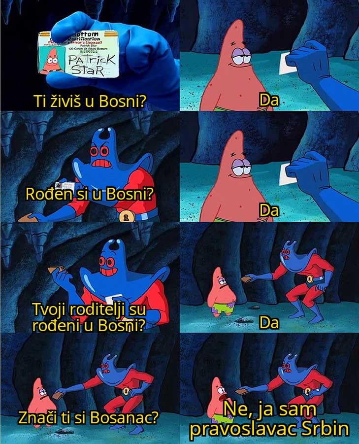 Zamisli da Kurde u Turskoj probaš da ubijediš da su Turci, šta ima. Evo ja se smatram Bosanac, Srbin, pravoslavac, a u drugu ruku jebe mi se i ko sam ja i ko su svi ostali, sjašite s grbače više s ovim budalaštinama. Dokazivanje ko je ko i ubjeđivanjem drugih ko su oni i šta si ti, samo pokazuje komplekse i apsolutno ništa više.