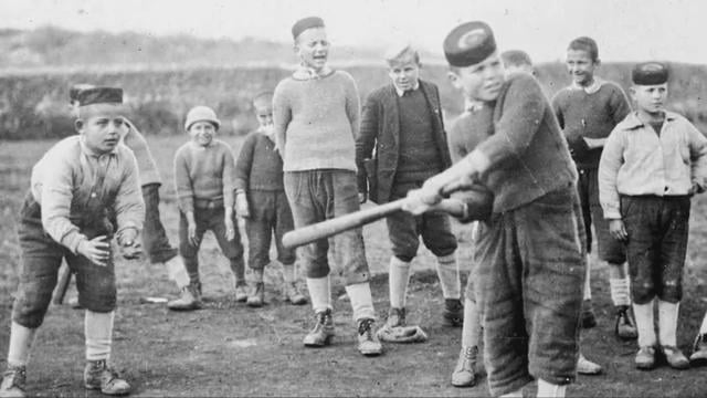 Kinder in Montenegro spielen Baseball. Little Montenegrine in Bjelopavlići in der Nähe von Danilovgrad (Branelovica) spielt vor mehr als hundert Jahren Baseball, ein typisches amerikanisches Sportspiel. Das Foto wurde während der Arbeit der amerikanischen Roten Kreuzung in Montenegro von 1919-1922 erstellt.