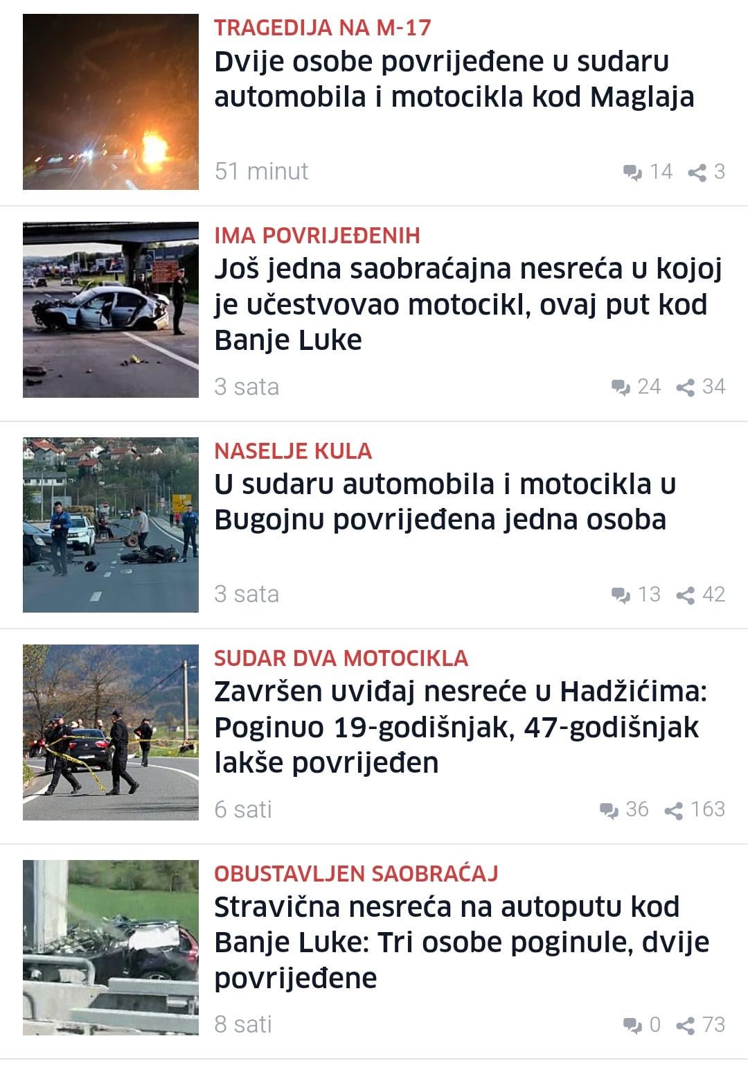 U čeitiri nesreće motori uključeni, ne volim ih u saobračaju sresti, večina ih brzo i divlje vozi.