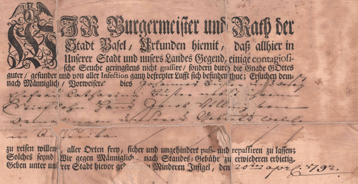 German (AI): FR Burgermeister und Rath der Stadt Basel, Bekunden hiemit, daß allhier in Unserer Stadt und unsers Landes Gegend, einige contagio se Seuche geringstens nicht grassire/ sondern durch die Gnade GOttes guter/ gesunder und von aller Infection ganz befreyter Lufft sich befinden thue: Ersuchen dem nach Männiglich/ Vorweisere dieses zu reisen willen, aller Orten frey, sicher und ungehindert pass und repassiren zu lassen; Solches seynd Wir gegen Männiglich nach Standes Gebühr zu erwiederen erbietig. Geben unter unsrer Stadt hievor ge drukten Insigel, den 20 apr. 1792.